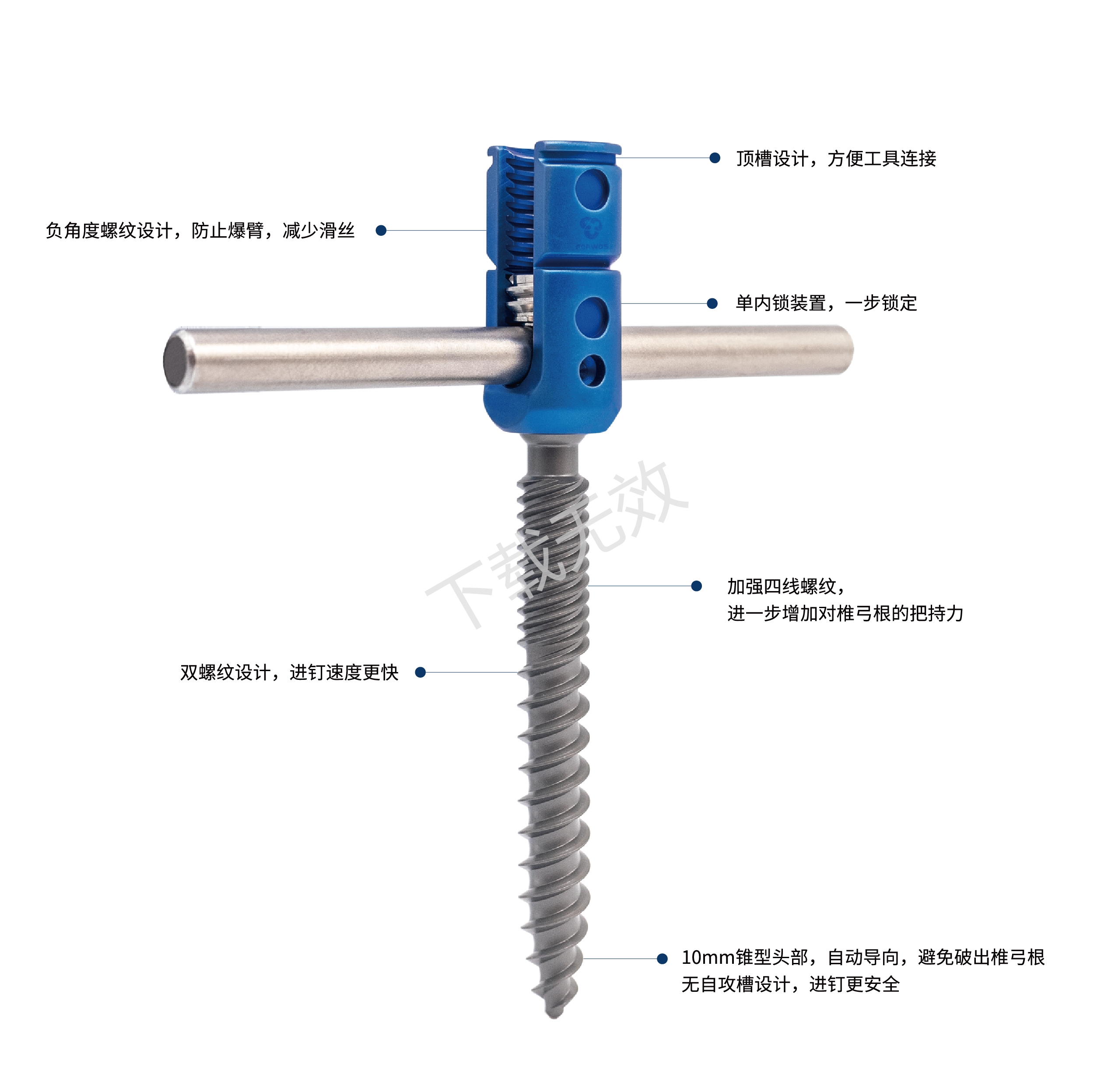 4、10mm錐型頭部,自動導向,避免破出椎弓根;